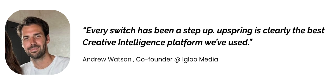 Every week, Igloo now anchors client weekly sync in upspring. Instead of sending static reports, the team opens live dashboards, showing exactly which creatives, hooks, and competitors are driving results. This transformed Weekly’s from one-way reporting sessions into collaborative strategy discussions. Clients left meetings not just updated — but confident that their agency was ahead of the curve. When data is shared - it builds trust as we have one source of truth to rely on.